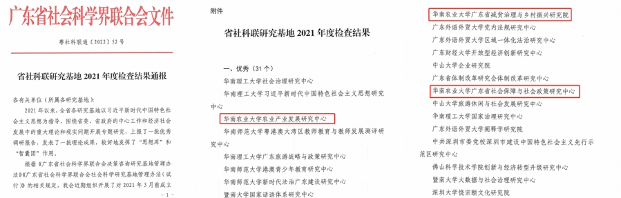 近日,广东省社会科学界联合会公布2021年度研究基地检查(验收)结果,我校农业产业发展研究中心、广东省社会保障与社会政策研究中心、广东省减贫治理与乡村振兴研究院3个研究基地获得“优秀”等级,这是近年来我校在省社科联研究基地年度验收考核获得的最好成绩。