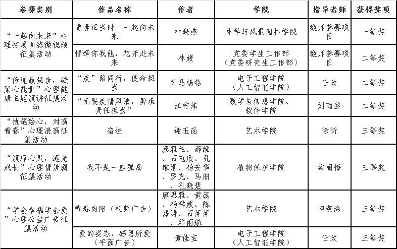 近日,广东省教育厅发文对“5.25”大学生心理健康月系列活动进行表彰,我校师生在心理漫画、心理情景剧、心理健康主题演讲、心理公益广告、心理拓展训练微视频等征集活动中获得一等奖1项、二等奖3项、三等奖4项,详见下表。