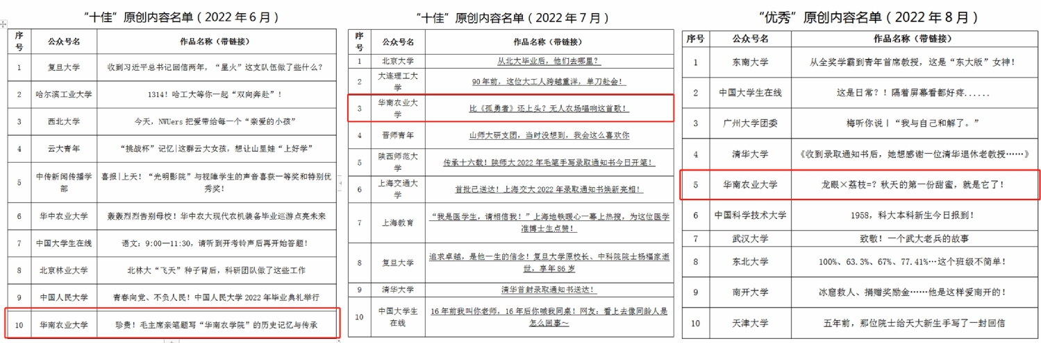 为充分发挥新媒体平台对高校思想政治工作的促进作用,11月3日,高校思政类公众号重点建设项目组在中央宣传部、中央网信办、教育部、共青团中央的指导下,公布了2022年6、7、8月重点建设公众号优秀原创内容评选结果。我校2篇官微作品《珍贵!毛主席亲笔题写“华南农学院”的历史记忆与传承》《比《孤勇者》还上头?无人农场唱响这首歌!》分别获评高校思政类重点建设公众号6、7月“十佳”原创内容(全国每月仅评10篇),1篇官微作品《龙眼×荔枝=?秋天的第一份甜蜜,就是它了!》获评高校思政类重点建设公众号8月“优秀”原创内容(全国每月仅评10篇)。