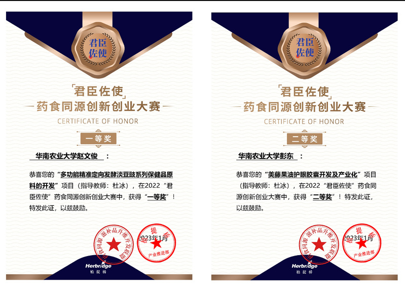 近日,2022“君臣佐使”药食同源创新创业大赛圆满落幕,在我校食品学院国家中药材产业技术体系岗位科学家团队带头人杜冰教授指导赵文俊和彭东两名同学的项目从参赛的120余个项目中脱颖而出,分别荣获一等奖和二等奖