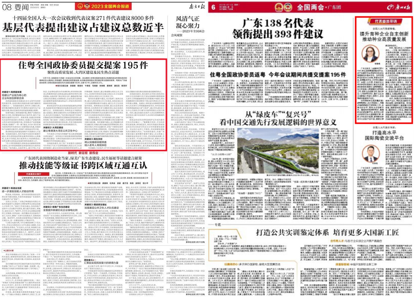 《南方日报》3月12日A08版 住粤全国政协委员提交提案195件 聚焦高质量发展、大湾区建设及民生热点话题