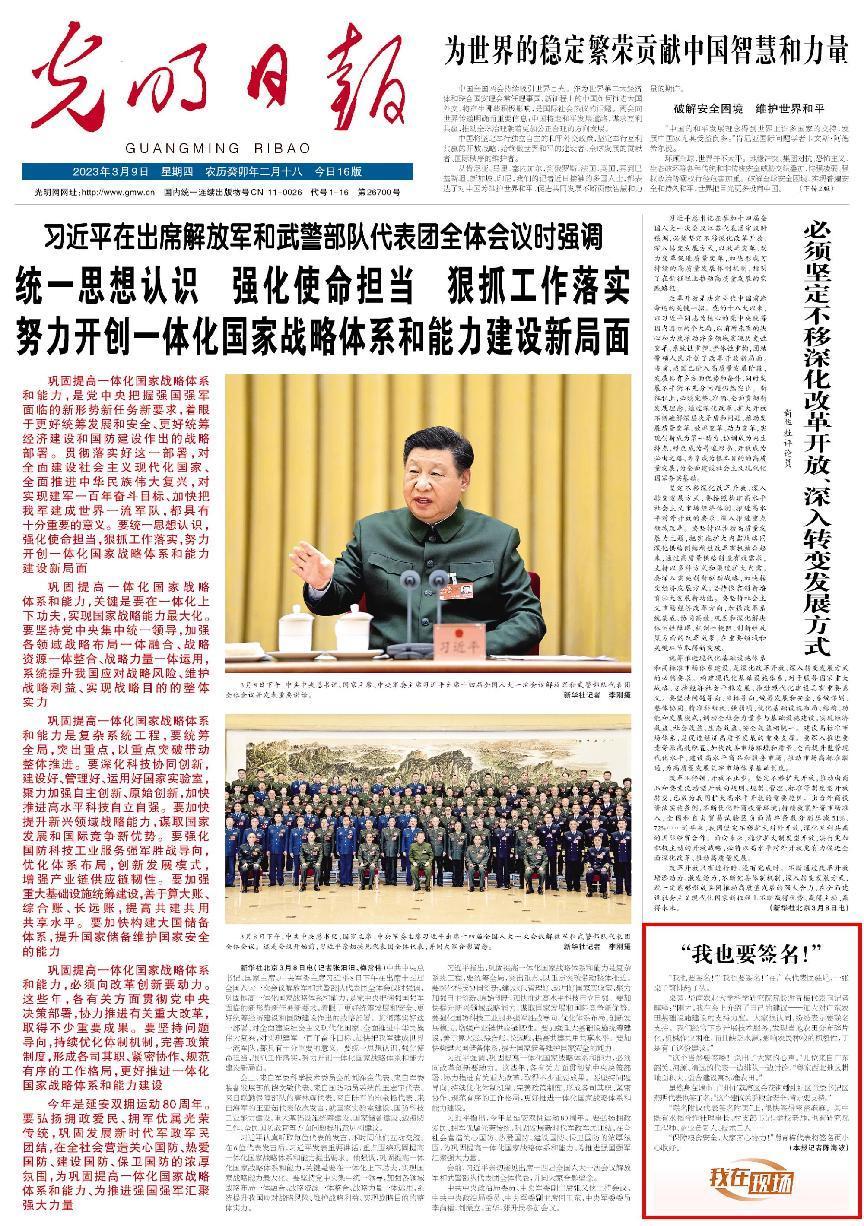 《光明日报》3月9日头版 “我也要签名!”