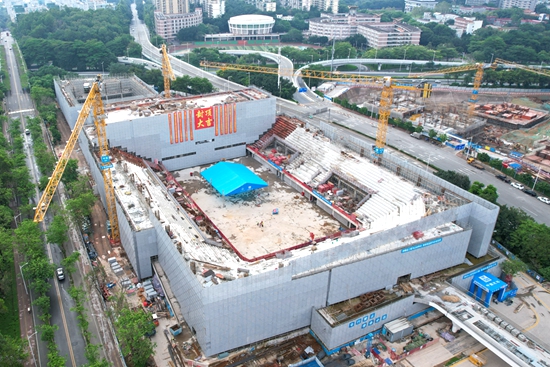 郭青松表示,自综合体育馆项目开工以来,中建八局发扬铁军精神,攻坚克难抢抓节点,克服了暴雨、疫情等困难,60天完成1548根工程桩和15万方土外运,55天冲出正负零,127天主体结构全面封顶,全力跑出履约加速度,整体施工进度稳步推进。同时,该项目顺利通过广东省和广州市优质结构、安全文明工地初验。下一步,中建八局将紧盯目标,抓好关键线路工期,全面发挥总承包管理能力,确保工程完美履约,顺利投入使用。