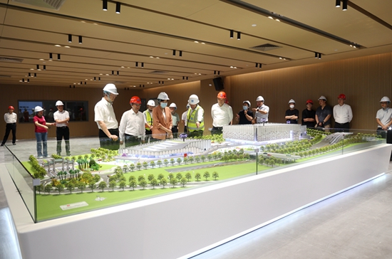 封顶仪式前,刘雅红参观综合体育馆沙盘模型,并听取项目负责人汇报有关情况