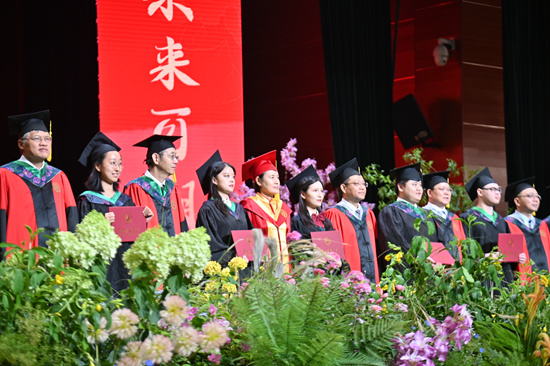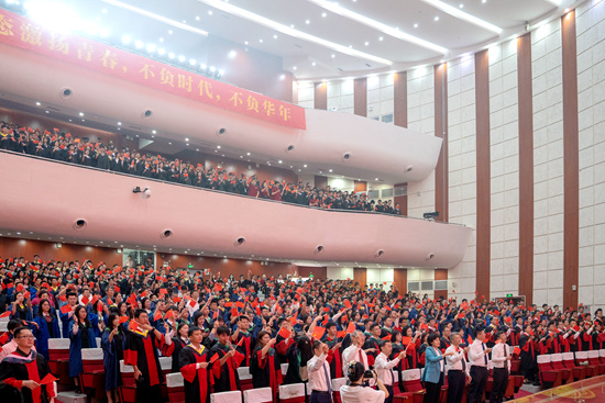 现场播放了毕业纪念片《青春的记忆》后,校合唱团的同学们身着学士服,带来合唱表演《我爱你中国》,唱出了华农学子真挚热烈的爱国之情。在优美而饱含深情的歌声中,全场师生起立,伴随着音乐的节奏一起挥舞手中的五星红旗,在现场汇聚成一片红色的海洋。
