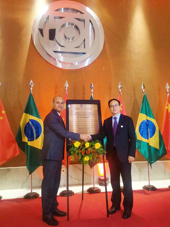 近日,我校副校长仇荣亮率团出访拉美多国。当地时间6月23日晚,我校和巴西马托格罗索联邦大学合作建立的“中文+农业科教发展中心”(简称“中心”)在马托格罗索联邦大学举行揭牌仪式。中国驻巴西大使祝青桥、教育部语言交流合作中心(简称“语合中心”)主任马箭飞发函祝贺,马托格罗索州秘书长Allan Kardec和Cesar Miranda、马托格罗索联邦大学校长Evandro Soares教授、我校副校长仇荣亮教授出席揭牌仪式并致辞。