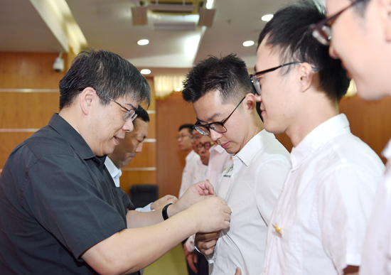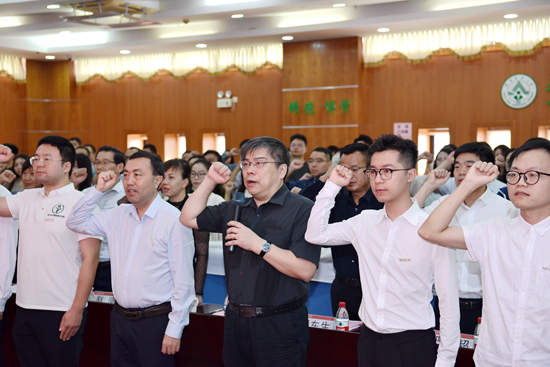 会上,薛红卫、邓国安为新进教职工代表佩戴校徽。薛红卫带领现场新进教职工作入职宣誓。