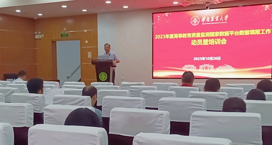 10月26日上午,学校在行政楼三楼报告厅召开2023年度高等教育质量监测国家数据平台数据填报工作动员部署会,副校长邓诣群出席会议并讲话。