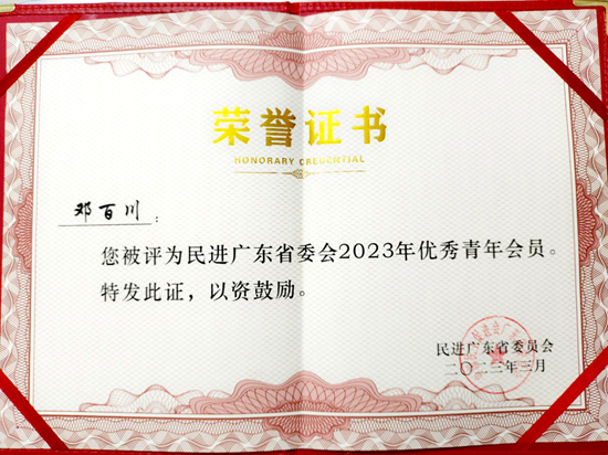 今年,我校民进基层委委员邓百川副教授担任民进广东省第九届委员会青年工作委员会副主任,荣获“民进广东省委会2023年优秀青年会员”荣誉称号。