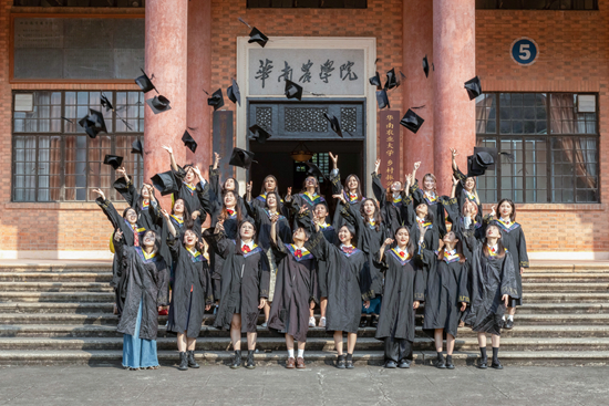 校友们在校史馆前抛起学士帽