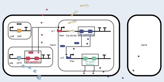 项目所设计的基因线路会使蛋白酶抑制剂CPTI先释放,以抑制幼虫肠道和口器内的蛋白酶,从而保护毒素蛋白Cry3A-like不被降解;待菌群达到一定丰度后,再释放后者产生对蚁后的毒害作用。同时,在基因回路的下游还引入了细胞裂解装置,以避免当细胞密度进一步增加、毒蛋白的浓度不断升高时,过高的毒素积累量造成幼虫提前死亡。