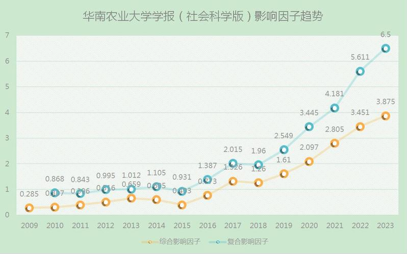 《华南农业大学学报(社会科学版)》自2002年创刊以来,坚持以特色办刊,以质量取文。2008年成功入选中国人文社会科学引文数据库(CSSCI),是当年进入的全国67家大学学报中创刊历史最短的学报。在工作中,编辑部始终秉持办刊宗旨,学报影响因子一路攀升,由首次评价中的0.17持续提升至6.5。2019年被教育部社科司、全国高等学校文科学报研究会评为“全国高校社科名刊”,2021年被国家哲学社会科学文献中心评为“最受欢迎期刊”,2023年被评为“全国高校精品社科期刊”。目前,《华南农业大学学报(社会科学版)》已进入国内全部主要核心学术期刊阵列。