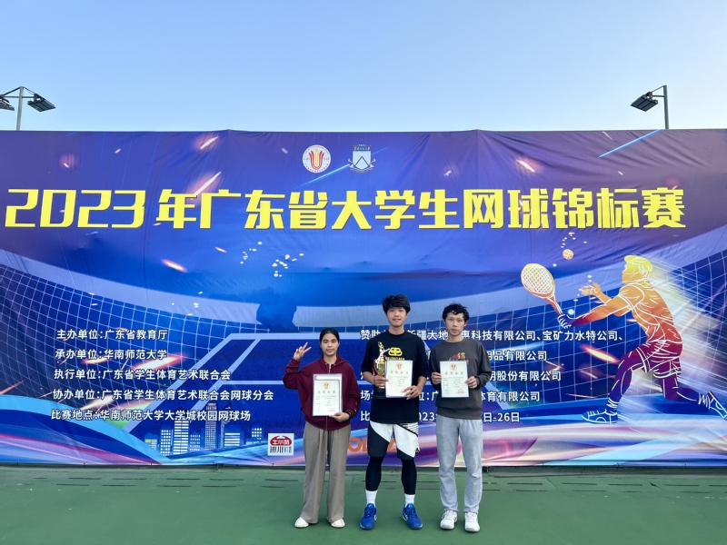 2023年广东省大学生网球锦标赛吸引省内近百所高校约900人参赛。经过四天的鏖战,我校学子最终斩获男子双打冠军、女子单打第八名的优异成绩,实现了我校网球队冠军零的突破。