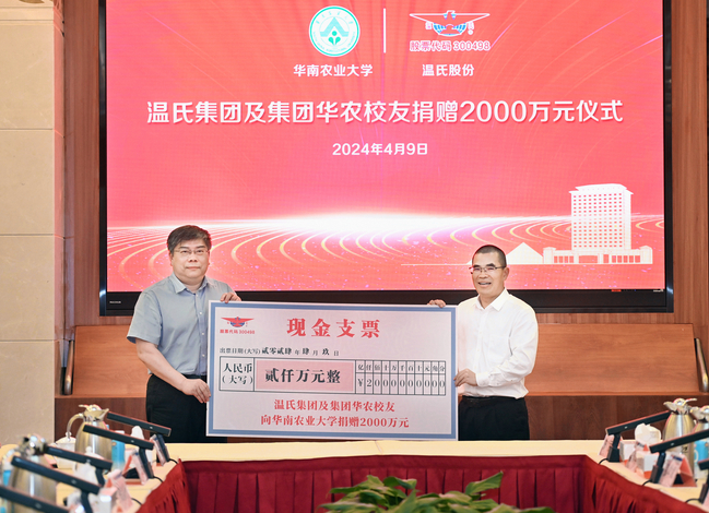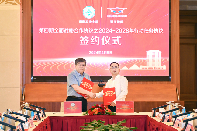 4月9日,校长薛红卫率队访问温氏集团,温氏集团董事长温志芬、总裁黎少松热情接待了薛红卫一行。双方签订了2024-2028年行动任务协议,标志着华农和温氏集团第四期全面战略合作进入深化落实阶段。会上还举行了温氏集团及集团华农校友捐赠2000万元仪式。