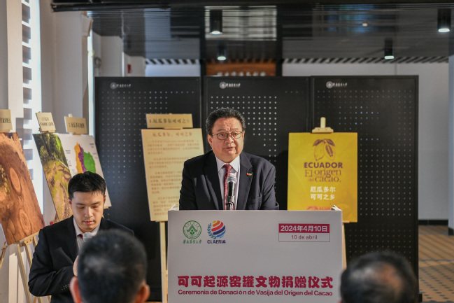 为推动中国与厄瓜多尔文化交流互鉴,迎接华南农业大学115周年校庆,4月10日上午,我校联合厄瓜多尔驻广州总领馆在华南农业博物馆举办了一场“开放华农”特别文化活动——厄瓜多尔可可起源窑罐文物捐赠仪式。我校副校长仇荣亮、厄瓜多尔驻穗总领事Edwin Martinez出席活动并致辞。国际交流处负责人主持了仪式。