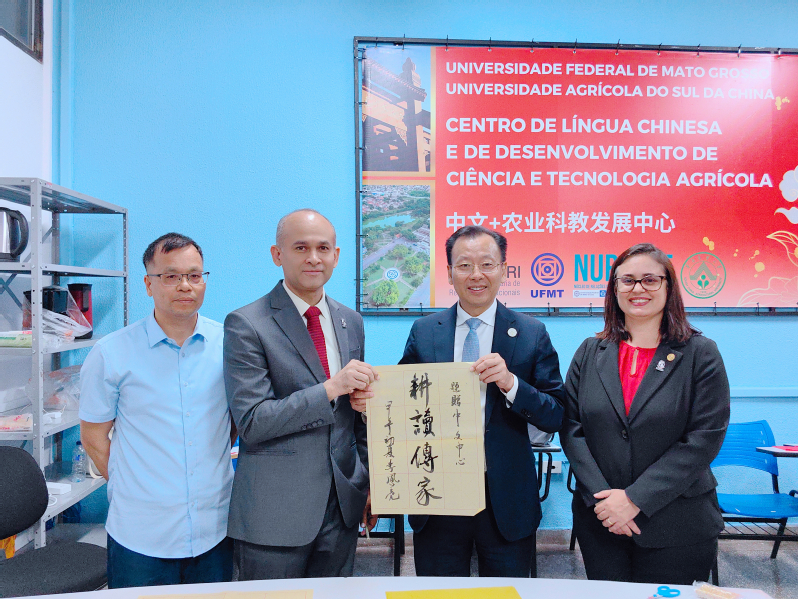 在巴西马托格罗索联邦大学访问期间,李凤亮一行在校长Evandro Soares da Silva及我校派出的中方主任刘可星陪同下,详细调研了学校首个海外实体“中文+农业科教发展中心”的运行、管理等实际建设情况,并就遇到的问题和下一步工作计划进行了深入交流探讨。在中拉联盟框架下,我校与马托格罗索联邦大学于2022年6月签约共建全球首批“中文+农业科教发展中心”,两年来,双方互设语言交换课程,共享语言师资,并派驻志愿者和中方主任在巴西上任。李凤亮表示将继续加强合作,推动“中文+农业科教发展中心”创新发展,提升中文教育的经济价值,为中国高校在拉美开展“中文+农业”项目积累更多宝贵经验,促进中巴两国在农业科技、教育推广等领域的交流与合作,为增进两国人民福祉作出更大的贡献。