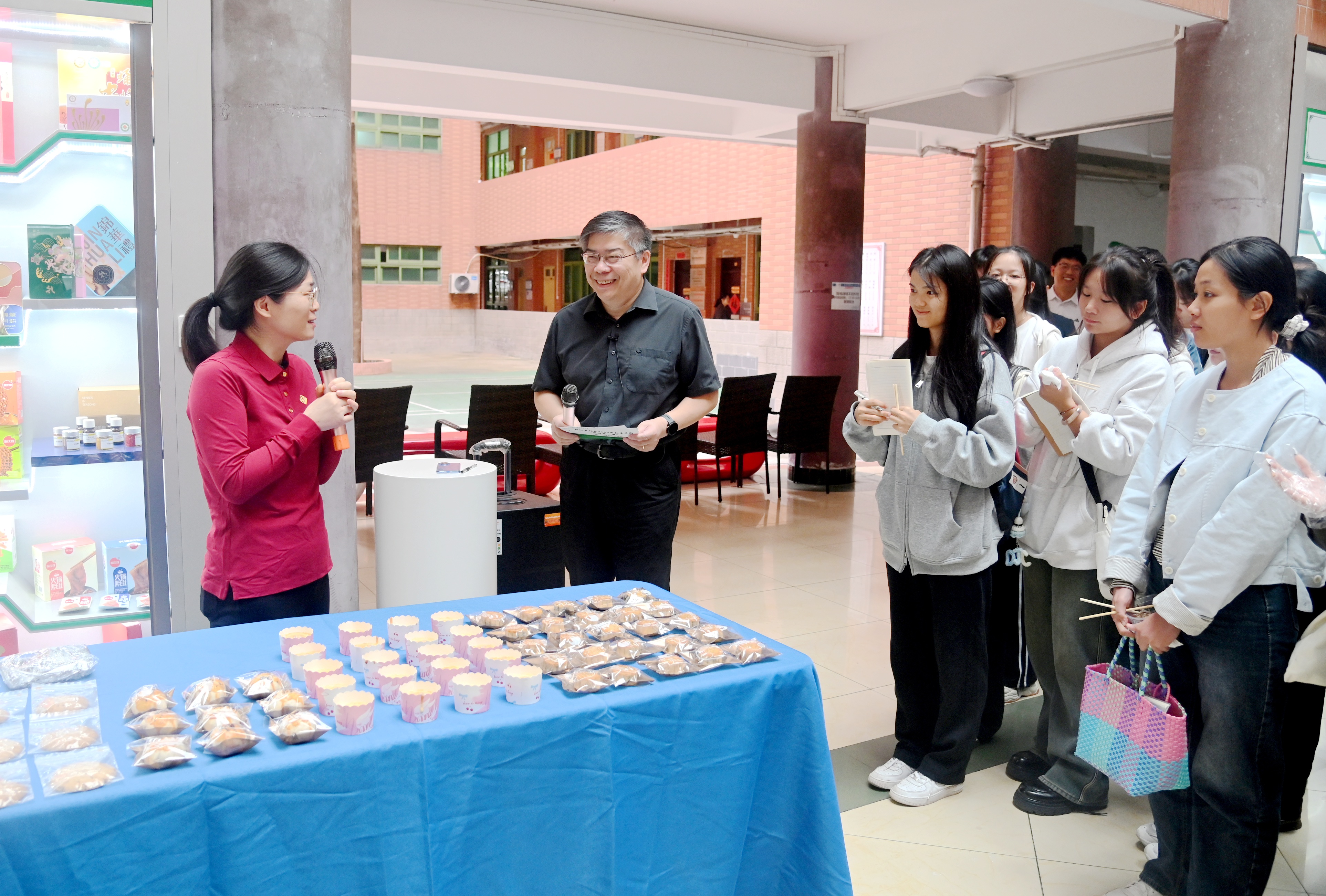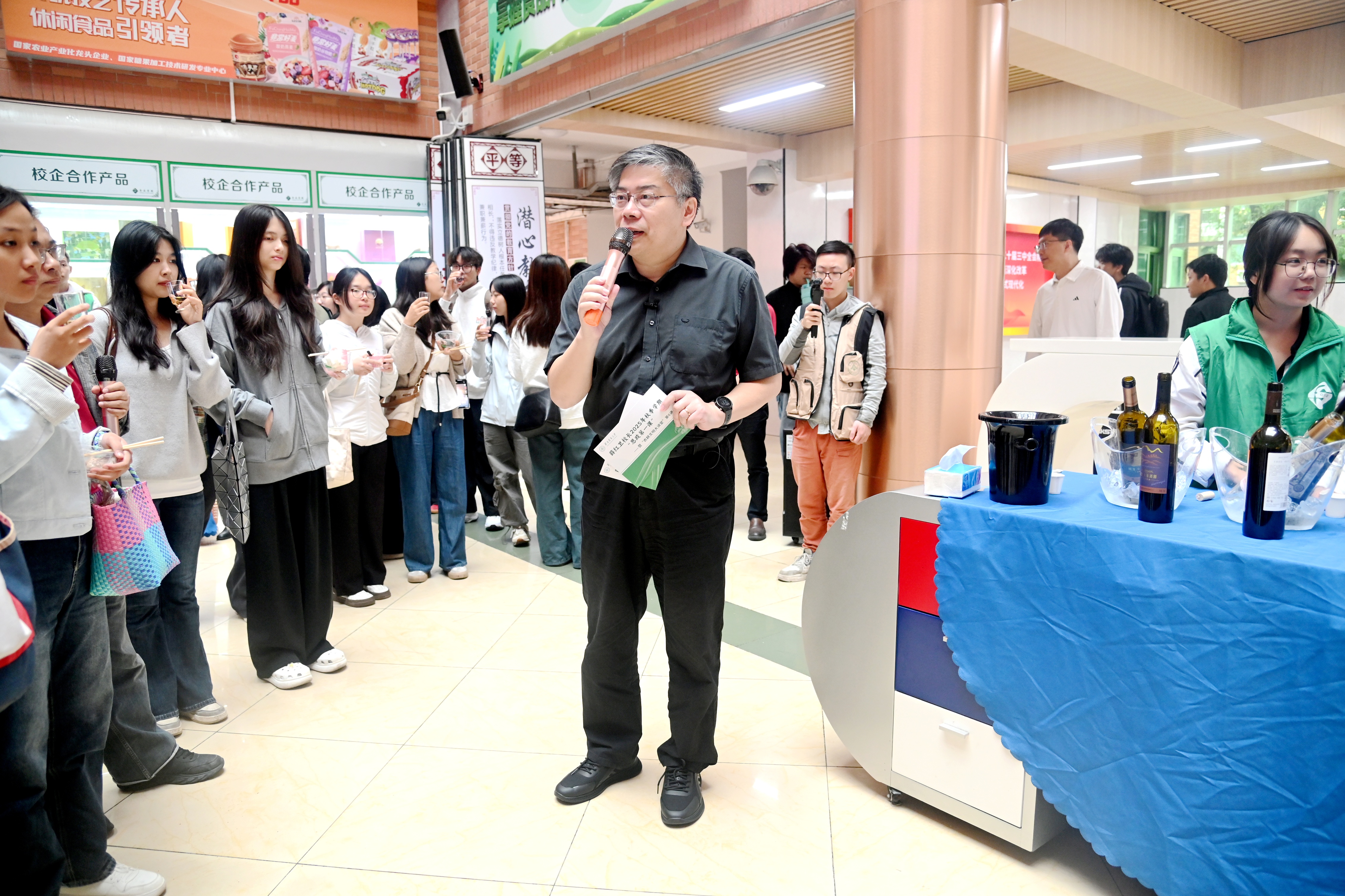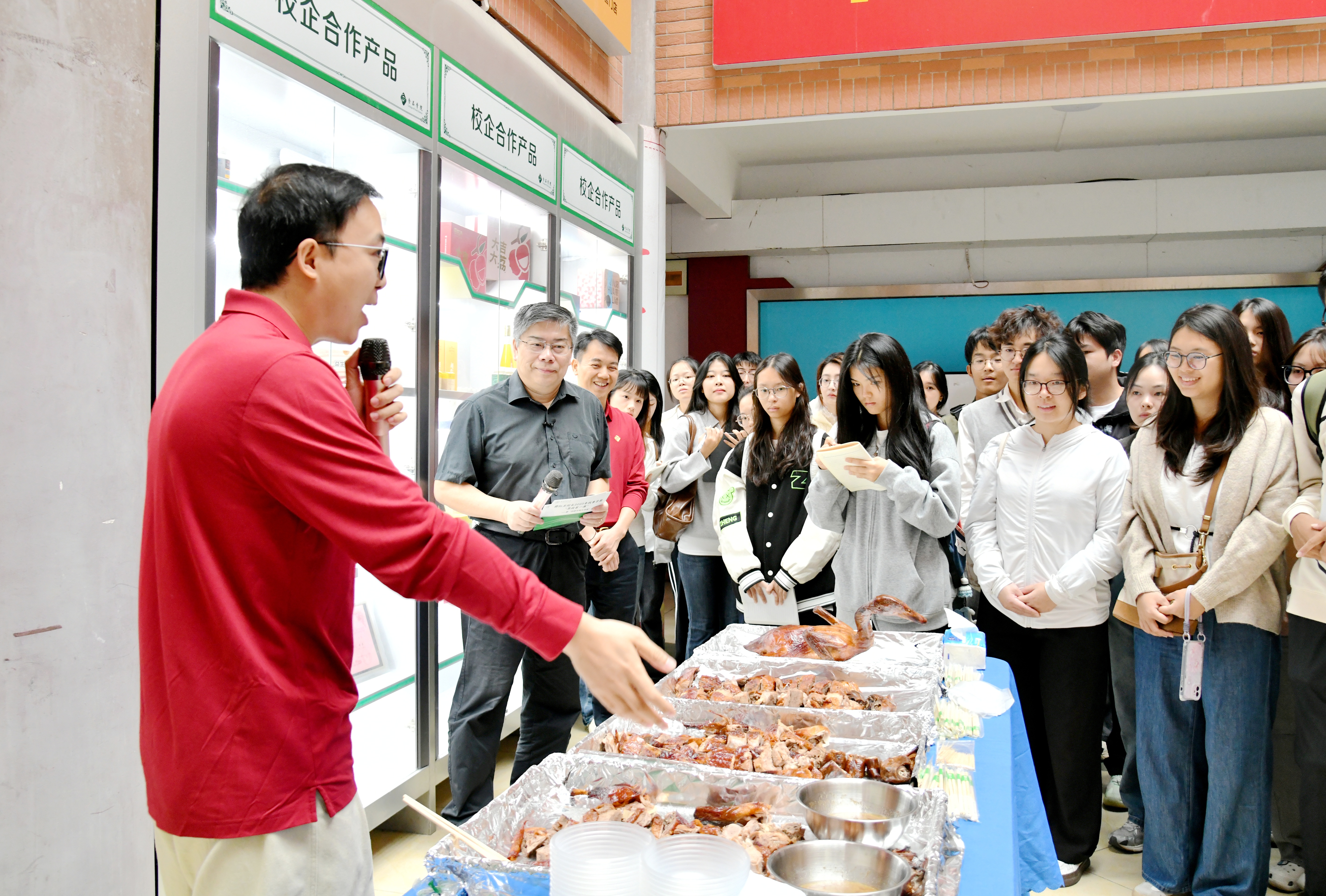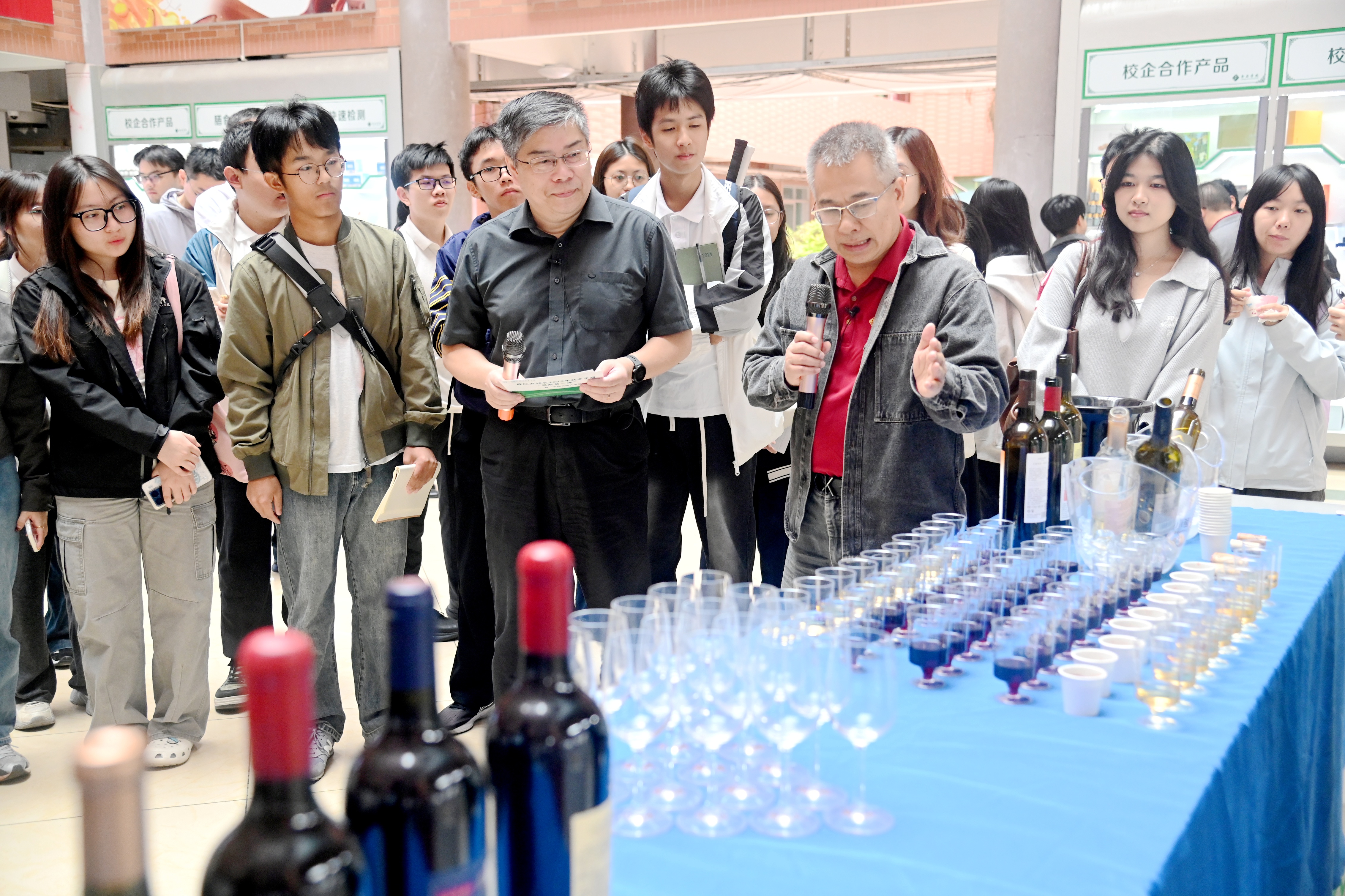在畜禽产品区,艾民珉副教授向同学们分享了脆皮烤鸭的制作流程;在谷物产品区,黄卫娟副教授为同学们讲解了烘焙食品的制作小技巧;在红酒产品区,廖振林教授给同学们讲解了红酒的酿造工艺,并邀请同学们参加学校即将举行的第三届全国大学生葡萄与葡萄酒科学文化节;在功能食品区,陈运娇副教授带来了利用“冻眠技术”保鲜的荔枝和以荔枝为原料开发的饮品及衍生食品;在快检产品区,徐振林教授为同学们展示了食品安全快速检测的技术;在果蔬加工区,赵雷教授带着同学们走进生产线,请同学们品尝鲜橙果汁。在体验的过程中,同学们品尝了不一样的“华农味道”,体验了食品营养与食品安全背后的科技力量。