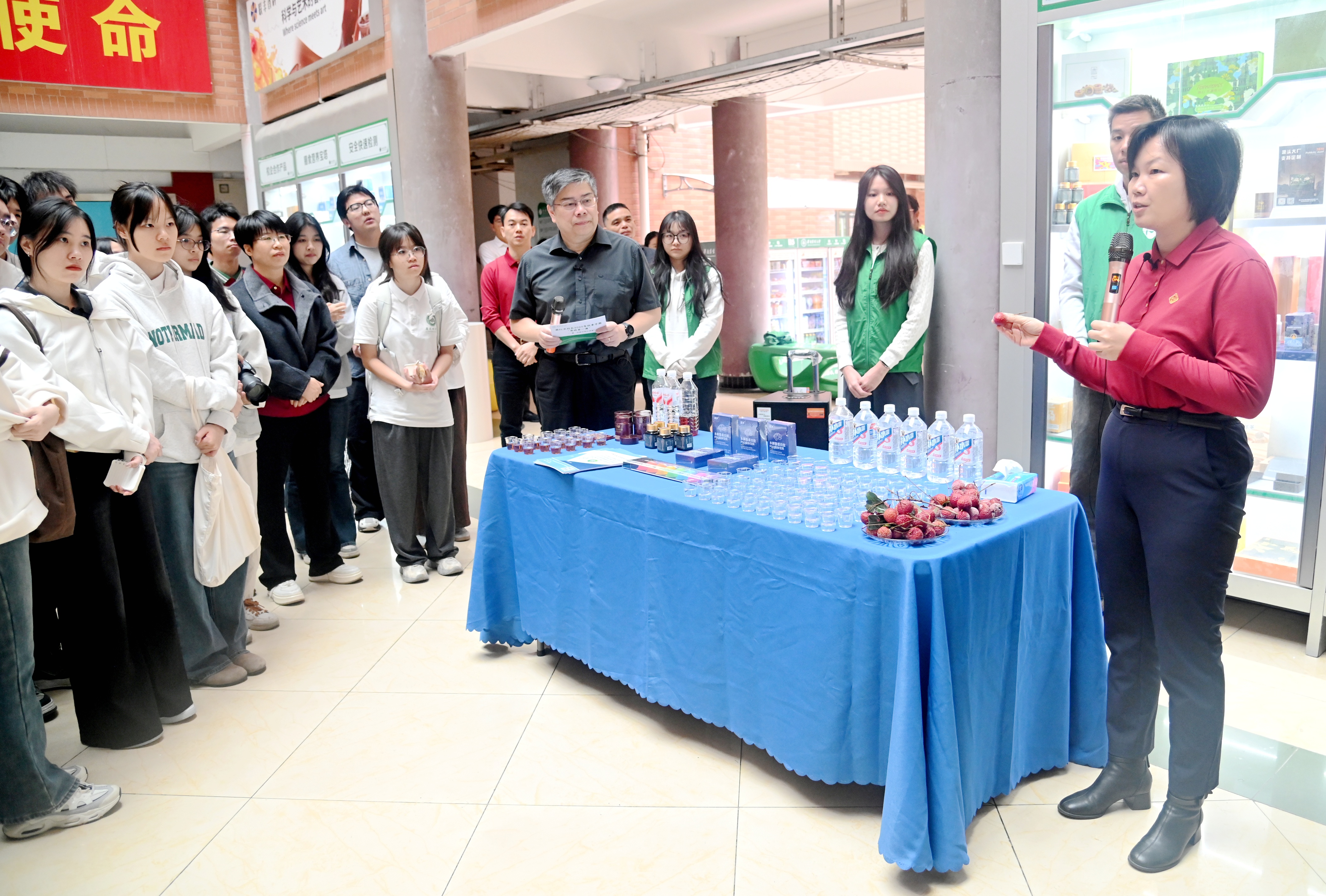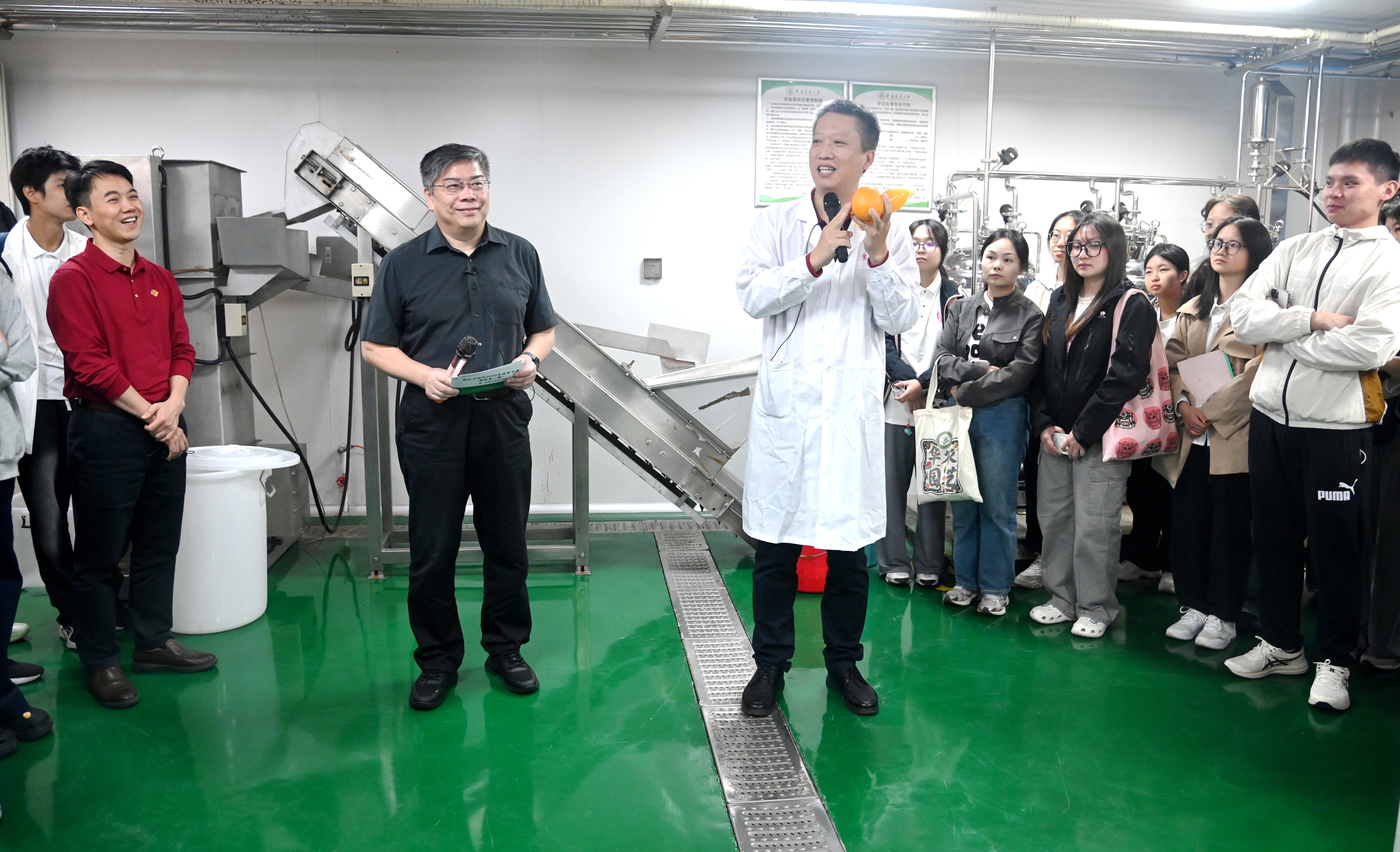 本次“行走的思政课”采取“实践体验”和“理论授课”相结合的形式展开,薛红卫带领同学们在畜禽产品区、谷物产品区、功能食品区、快检产品区、果蔬加工区等展示区逐一体验食品营养、食品安全等学科特色和科技创新成果,品尝烤鸭、饼干、红酒、果汁、冻眠荔枝等美食佳饮,深刻感悟大食物观的丰富内涵。