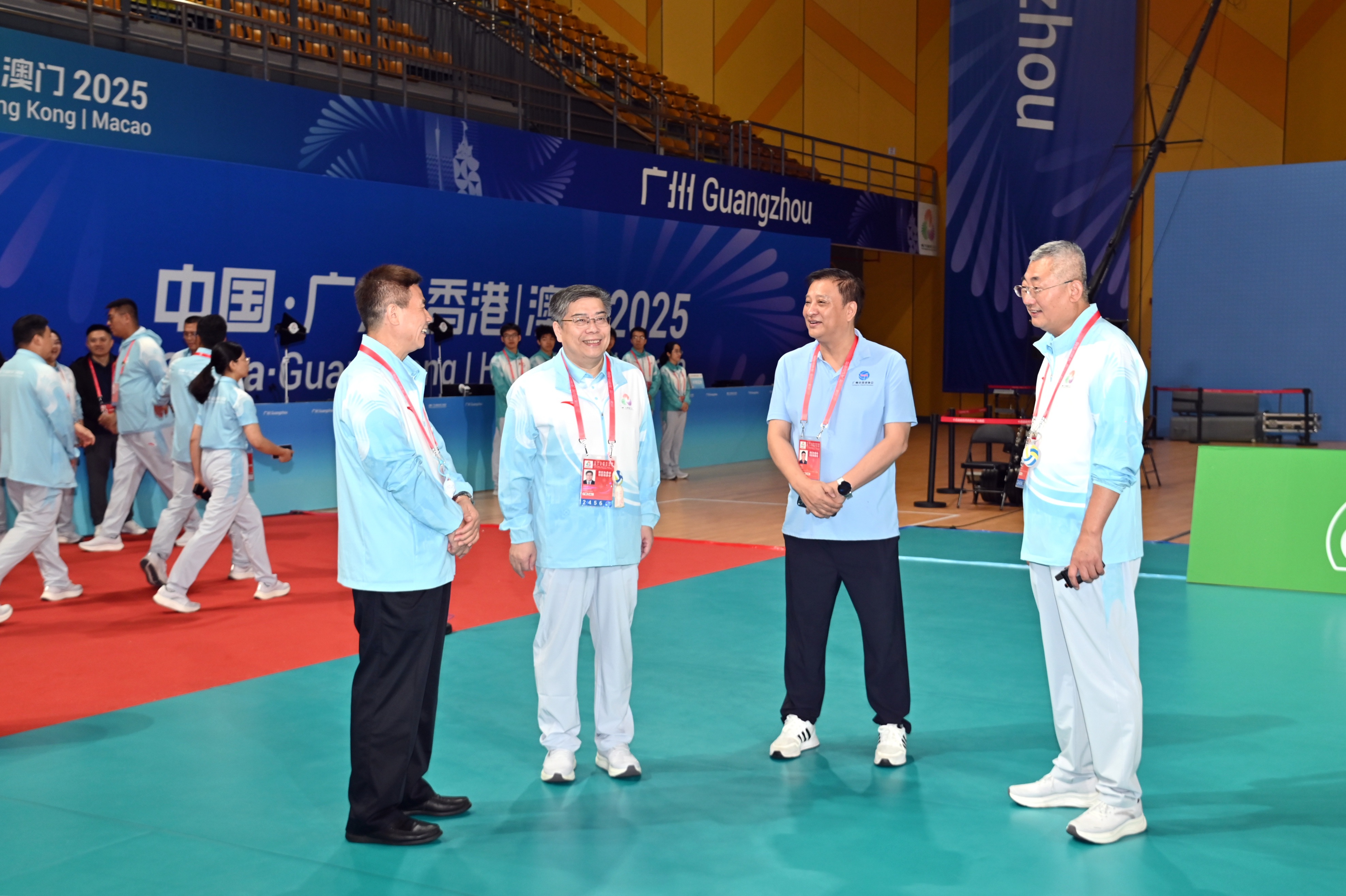 11月3日,第十五届全国运动会(以下简称“十五运会”)广州赛区执委会副主任、华南农业大学党委副书记、校长薛红卫到体育馆看望慰问服务十五运会师生团队,排球竞委会执行主任邢立明,排球竞委会副主任、副校长杨运东陪同慰问。