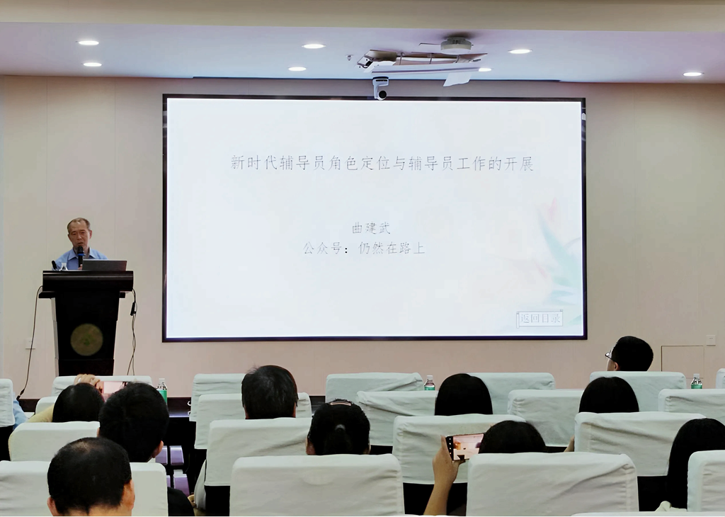 曲建武以“新时代辅导员角色定位与辅导员工作的开展”为题,结合四十余年一线思政工作的深厚积淀与生动育人案例,从政治引领、文化传承、学生成长和人民满意等多个维度,系统深入解读了新时代高校辅导员的角色定位和使命担当。报告中,泛黄的书信手稿、定格家访瞬间的照片、满是喜气的学生婚礼合影……字里行间、画面内外,串联起一个个充满温情的故事。他表示,辅导员要坚定理想信念、提升专业素养、锤炼师德师风,将思想引领融入日常关怀。