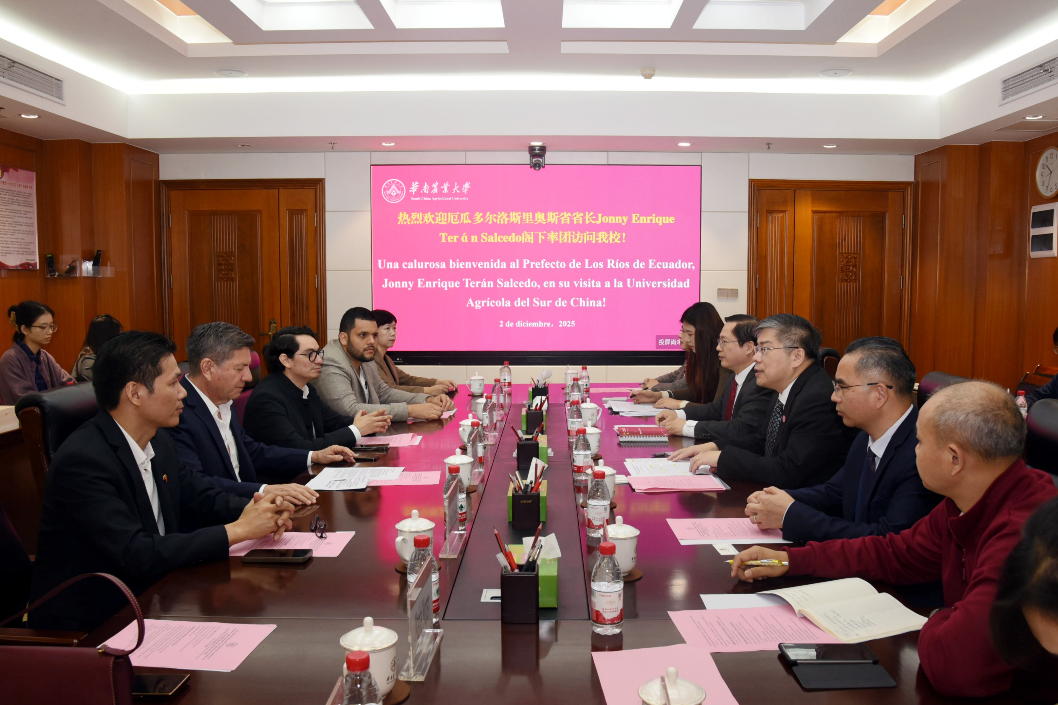 12月2日,厄瓜多尔洛斯里奥斯省省长乔尼·恩里克·特兰·萨尔塞多率团访问华南农业大学,洽谈农业发展合作事宜。校长薛红卫、副校长陈乐天接待来宾并座谈。