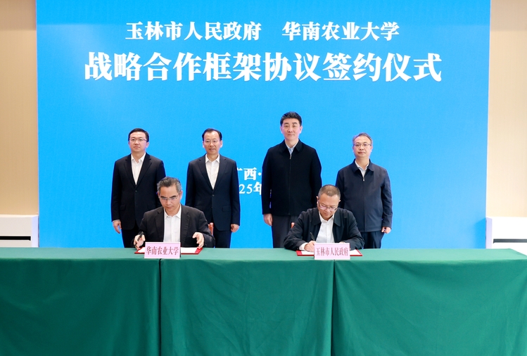 12月23日,华南农业大学与广西壮族自治区玉林市政府签署战略合作框架协议。双方将围绕科技创新与成果转化、人才培养与交流、产业创新与融合发展、文化传承与社会服务四大领域开展合作,将华农科技人才优势与玉林产业资源优势深度融合,助力玉林农业产业转型升级和乡村振兴。华农党委书记李凤亮,玉林市委书记王琛,华农党委副书记陈磊、副校长陈乐天,玉林市委副书记邓国忠,玉林市委常委、政法委书记甘文波,玉林市副市长马少华出席签约仪式并座谈。