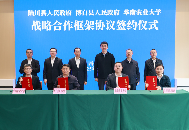 围绕陆川猪产业传承创新发展、水稻制种全产业链、乡村振兴人才培训、绿色智慧农业技术服务4个项目,华农还分别与陆川县政府、博白县政府、玉林市农业农村局、玉林农投集团和玉林市农业科学院签署合作协议。