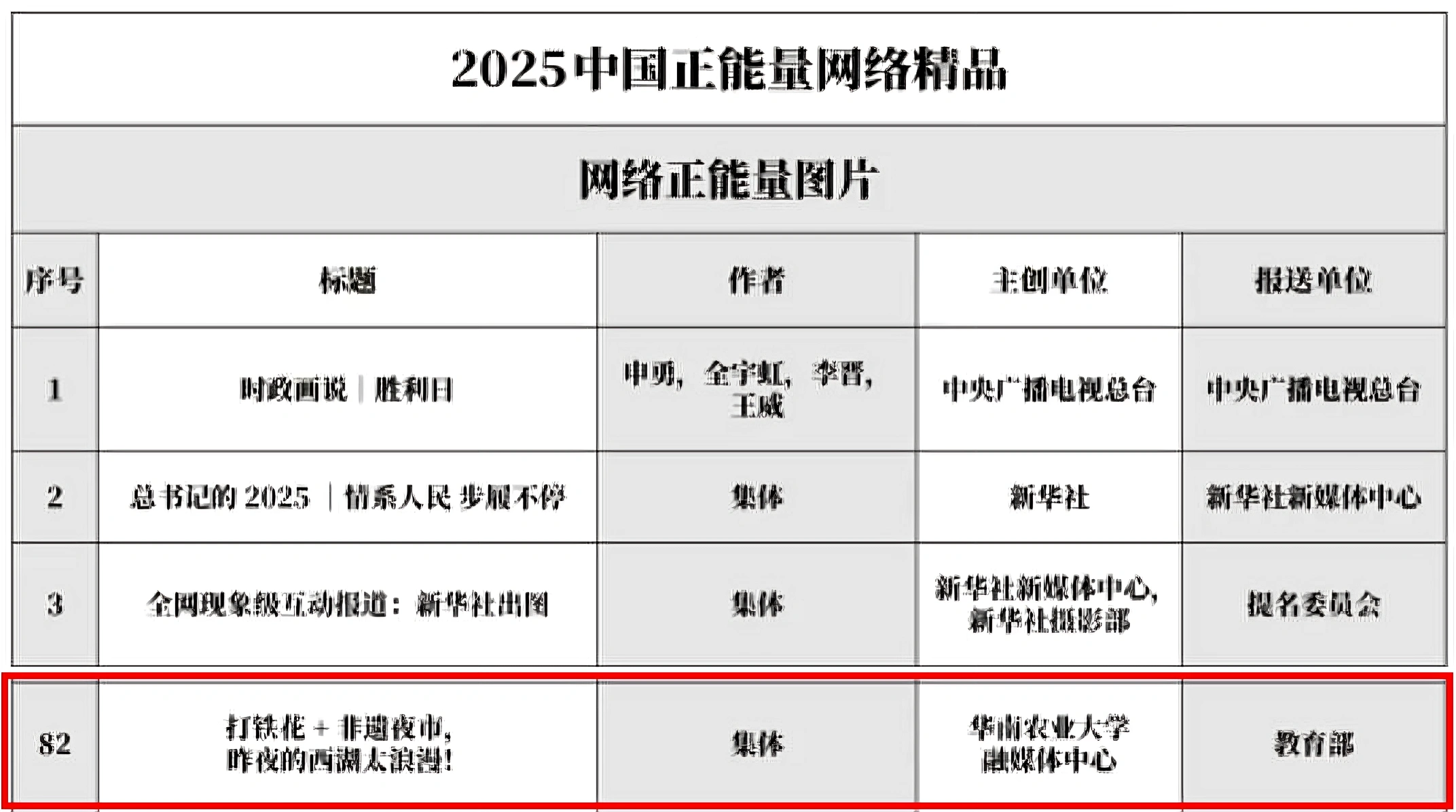 近日,中央网信办公示2025中国正能量网络精品征集展播活动结果,由教育部推荐报送的华农官微推文《打铁花+非遗夜市,昨夜的西湖太浪漫!》入选“网络正能量图片”名单。