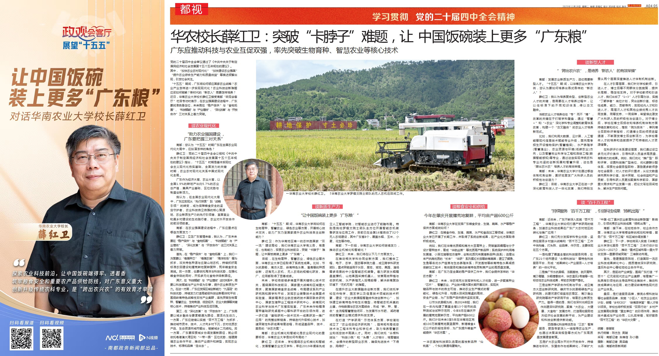 内聚人心,外塑形象。全年在国家级、省级等主流媒体发布相关报道1400余篇,其中,《南方日报》专访李凤亮书记《“顶天立地”加快建设农业特色世界一流大学》,作为“教育强国 高校何为”专栏开栏报道;新华网、南方都市报专访薛红卫校长畅谈“双一流”建设高校办学经验。以服务区域发展为契机,邀请新华社、中国日报等主流媒体赴茂名荔枝产业一线调研报道学校技术攻关成果,《南方日报》特刊整版聚焦学校服务“百千万工程”实践;在《中国日报》《科技日报》策划作物学科专题宣传。学校在全国高校网络育人能力提升专题研修班分享经验,联合中国教育在线主办华南高校宣传部研讨会。以学校参与举办十五运会和残特奥会相关赛事为契机,讲好赛场内外的华农故事,主流媒体发布报道3000余篇次,显著提升学校美誉度。