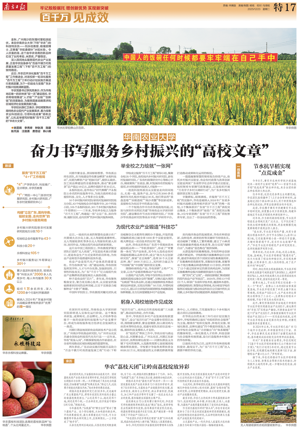 2025年,华农扎根南粤,在服务“百千万工程”和绿美广东建设中当先锋、打头阵,深入推进“双百行动”,在服务乡村振兴中彰显华农品牌。学校出台《深化服务“百千万工程”三年行动计划实施方案(2025—2027年)》,系统构建了“1345”工作体系,并特别部署了组织化服务、阵地化实施、领域化推进、品牌化建设四大专项行动。