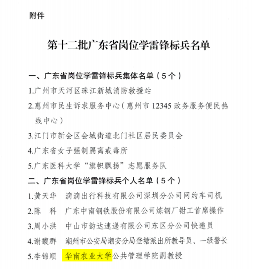 近日,中共广东省委宣传部命名了第十二批广东省岗位学雷锋标兵。其中,我校公共管理学院李锦顺老师入选“广东省岗位学雷锋标兵个人名单”,全省仅5人获此殊荣。